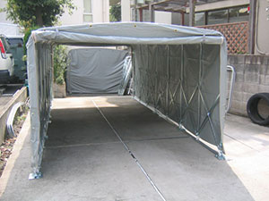 ガレージを伸縮できる特徴と幌の色オーダーを活かして、人や物をスルーさせる屋根カバー、資材置き場や工業用暗室、長期保存するジェットスキーや小型船舶等多くの目的で利用いただいております。